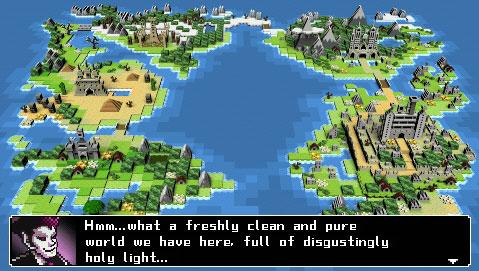 All of the world domination is conducted in a humorous and tongue-in-cheek manner in What Did I Do To Deserve This, My Lord!? 2. Badman is prone to funny quips, and his outlook on the world is wonderful as well. Even when you respond to his questions about the world and environment (with an "Aye" or a "Nay"), Badman will come up with a funny retort. One of my favorites is the conversation that takes place upon arriving in the world’s second area. If you state that you thought the underground would look different in different areas, Badman suggests putting colored plastic wrap over the screen if you want more variety. Also, once again the heroes and heroines are often named after popular personalities or are parodies of other games. It’s like each reference you notice is a reward for paying close attention.