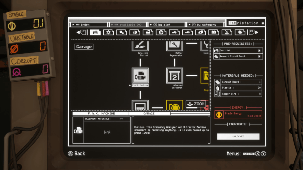 FAX Machine is short for Frequency Analyzer and X-tractor Machine, according to the Fabrication Station description. It’s a communication device used for transmitting short messages. Every time you visit the Auto Shop, it will beep if a new message has arrived. These messages are random and are mostly flavor text to emphasize the strangeness of the Zone.