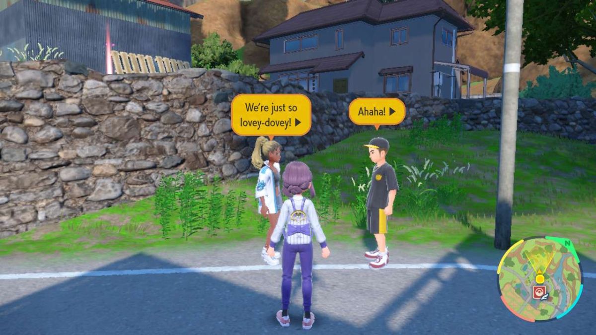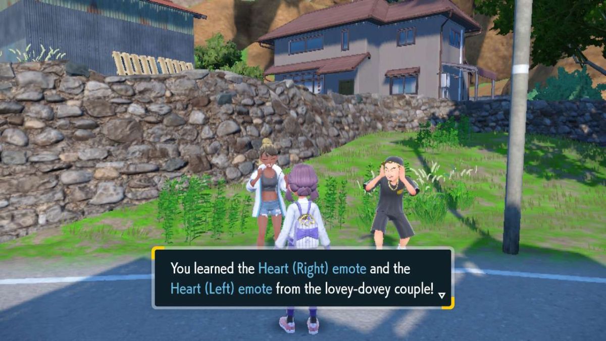 You can find the lovey-dovey couple in Mossui Town in Kitakami, specifically near the community center in the center of the town. Starting from outside the community center, turn a right toward Peachy’s shop, then take the first left past the yellow Union Circle machine. Go around the back of the building until you see a couple standing by a cobblestone wall, left of a cone and some tires. Speak to them, and they’ll request that you show them a “lovey-dovey” Pokemon. Below, I’ve included the exact location where you’ll find the couple in The Teal Mask DLC: