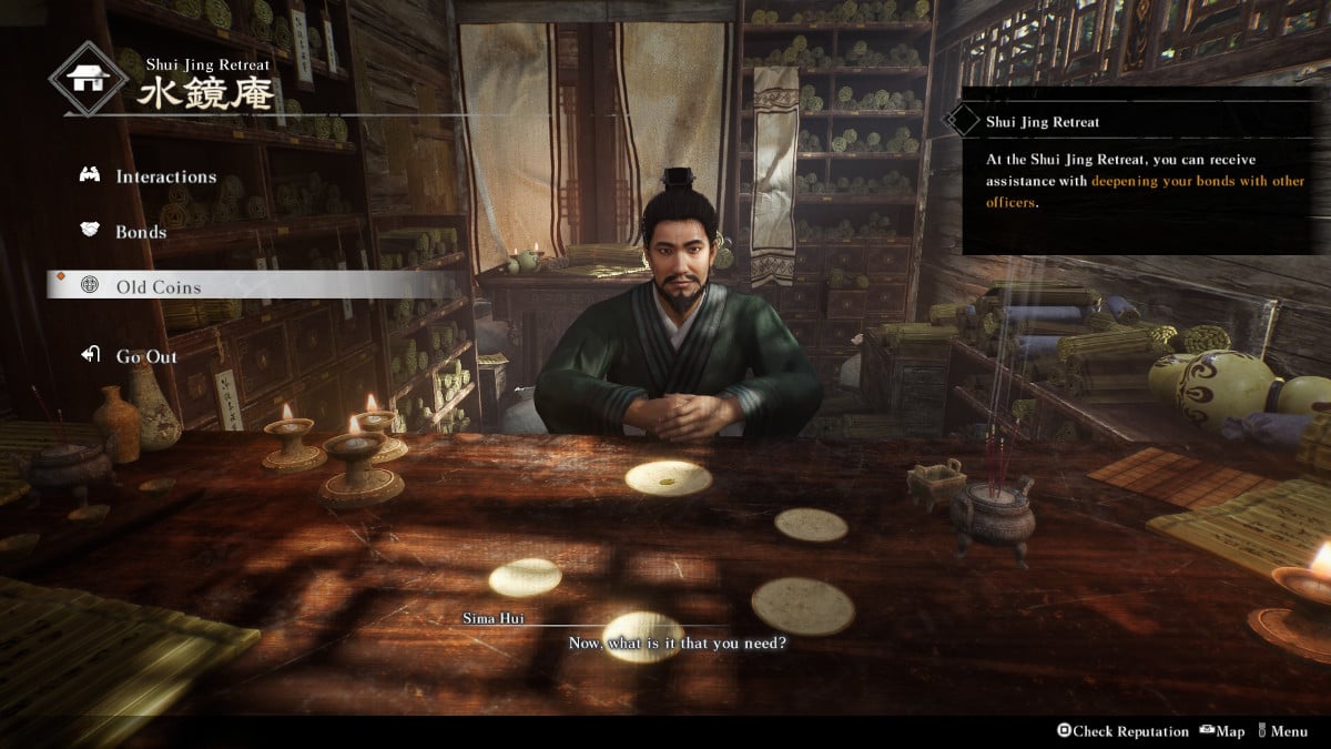 If you see any old coins while exploring the world map, pick them up immediately. Although you can’t utilize them until Chapter 2, it’s a good idea to stockpile as many as you can before then. The beginning of Chapter 2 will introduce you to several helper characters. These characters unlock additional features and mechanics for you to use. Among them is Sima Hui, owner of the Shui Jing Retreat, where you can check the status of your bonds with other warriors. Sima Hui will explain that old coins, while no longer valid currency, are still given to others as a token of appreciation or affection. He will then ask you to hand over any old coins you find on your travels, in exchange for rewards.
