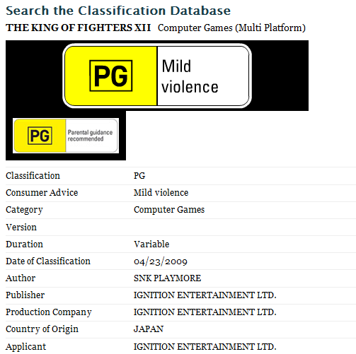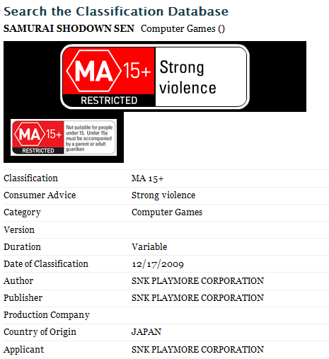 Here’s another unusual bit. According to Australia’s rating board, Ignition is not publishing or handling Samurai Shodown: Edge of Destiny in Oceania. The OFLC rating lists SNK Playmore as the publisher Samurai Shodown Sen. It appears SNK also changed the title to be closer to the Japanese name, Samurai Spirits Sen. Compare that to The King of Fighters XII OFLC rating which lists Ignition as everything except the author.