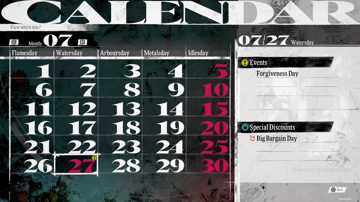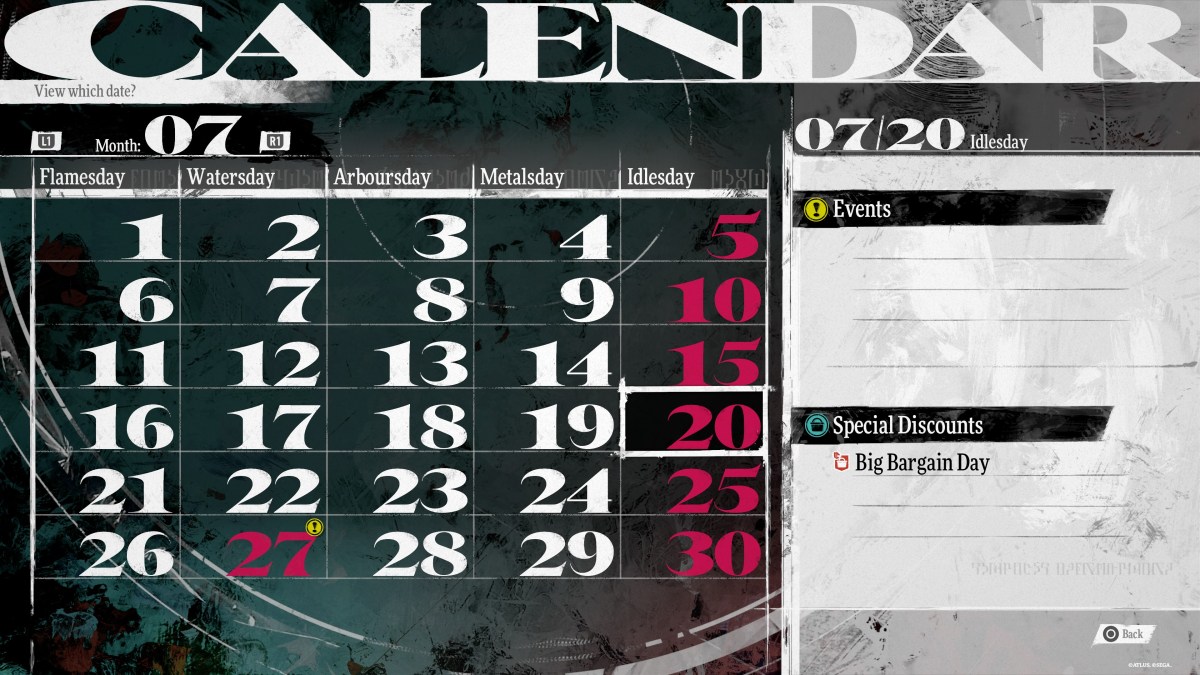 The easiest way to keep track of sales when you’re first starting out is to regularly check the calendar. In the main menu for Metaphor: ReFantazio, it’s one of the options you can select. You can see the current month, as well as upcoming months. Note that while the Special Discount events like Big Bargain Day and Weapon or Armour Shop Discount Days will be shown far in advance, sales pertaining to events will come up as story quests are completed.