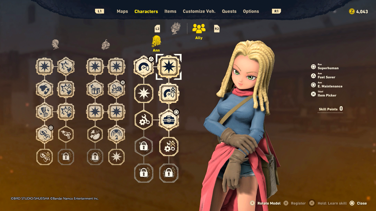 Having Ann in your party will unlock her skill tree, as well as have her accompany you in your travels alongside Rao and Thief. As the mechanic of the party, Ann’s skills focus on offering a wide variety of support options for your vehicle, from buffing to healing various status effects during combat.