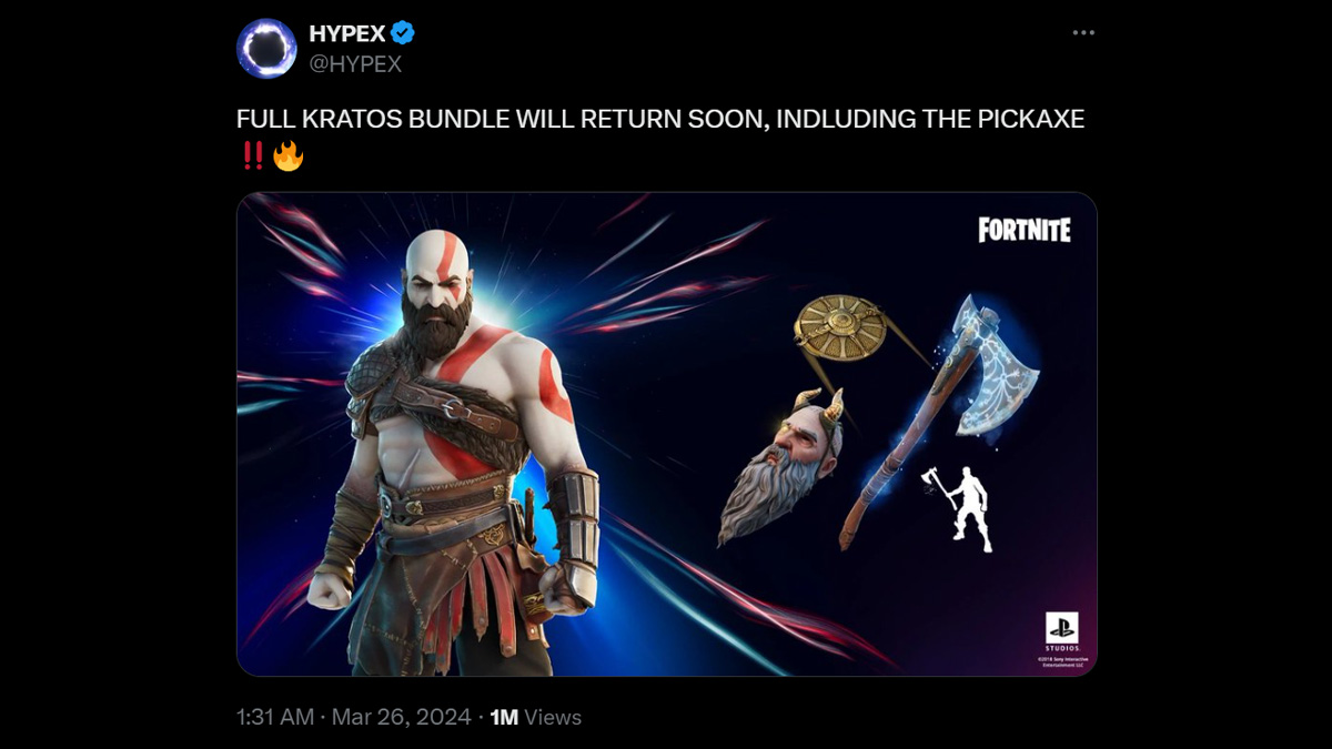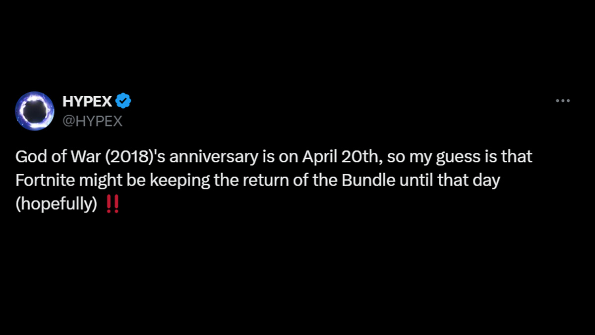 Interestingly, popular dataminer HypeX also theorized that the Kratos Fortnite skin could come back on April 20, 2024, due it to being the 5th anniversary of God of War. That would make sense, and perhaps Epic Games is specifically waiting to line it up with that special date.