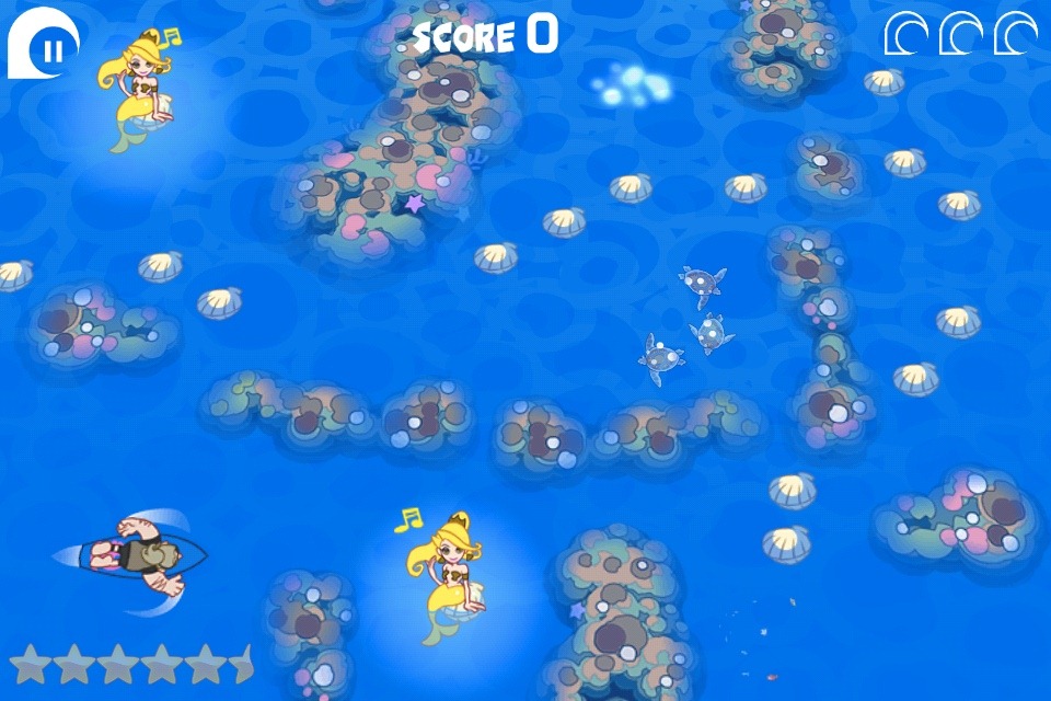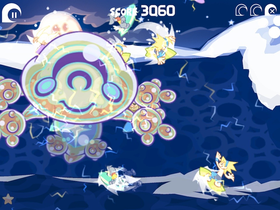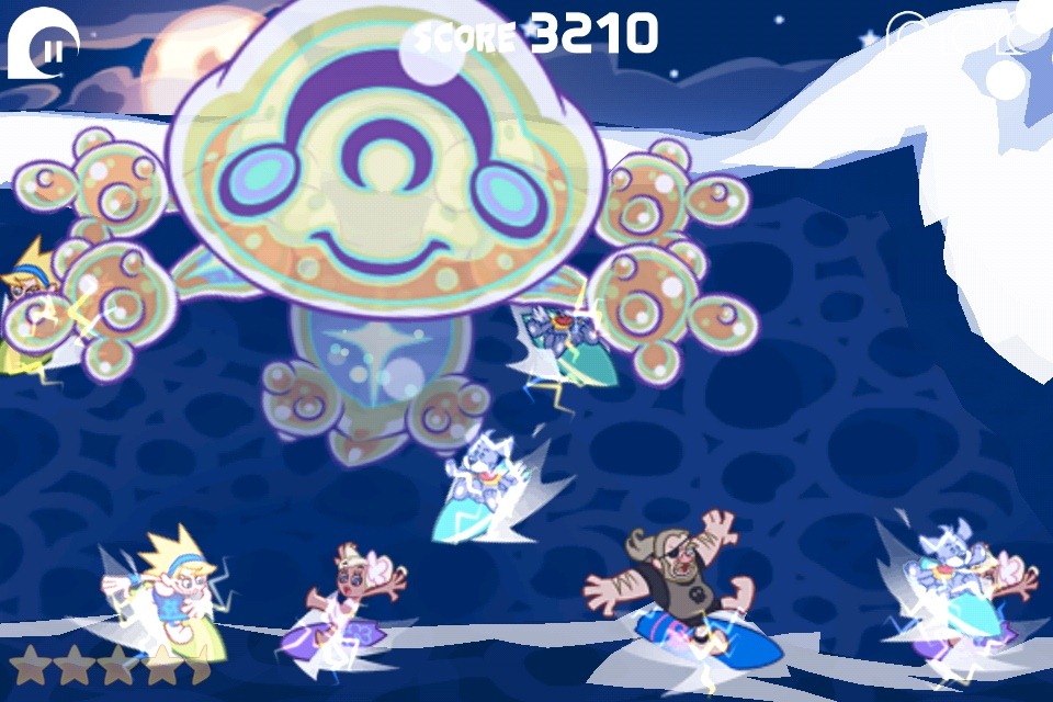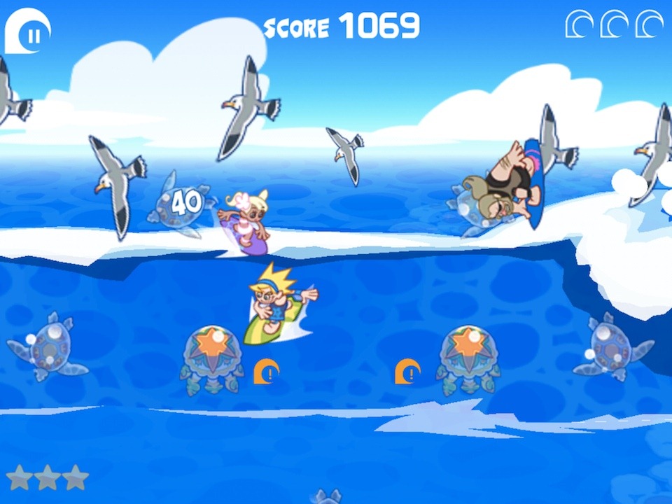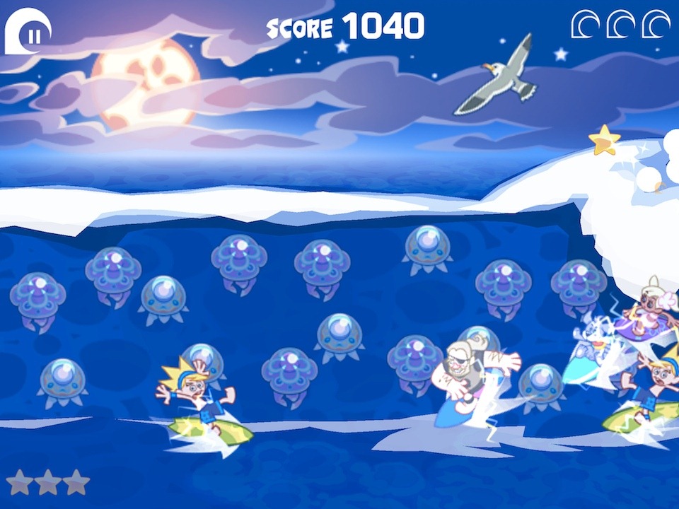 Hiso (the alien dude) flies around while players tap on the surfers to make them jump. If you rub Hiso he’ll hold up a star players can grab.