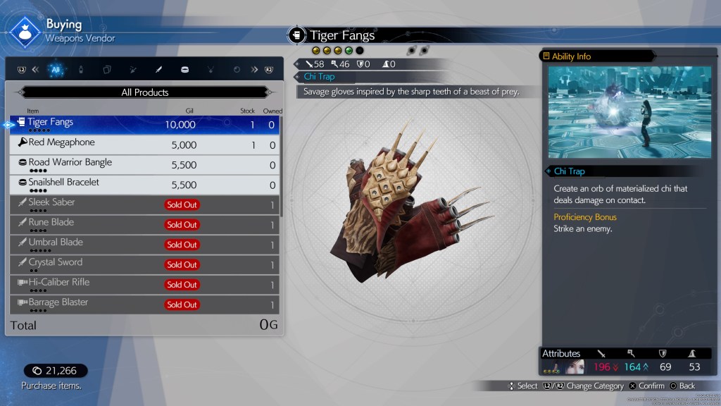 While odds are you’ll find most of your new equipment for characters by going through major campaign missions or optional quests, it is still worth checking the stores! You’ll potentially still find equipment there. I even noticed that a Crystal Sword you can get as you go through a Chapter 9 campaign mission for Cloud ended up showing up in the “sold out” inventory at the Chapter 10 Weapon Vendor in Cosmo Canyon, presumably as a means of being able to pick up an item you wouldn’t be able to “go back and get” during the main story.