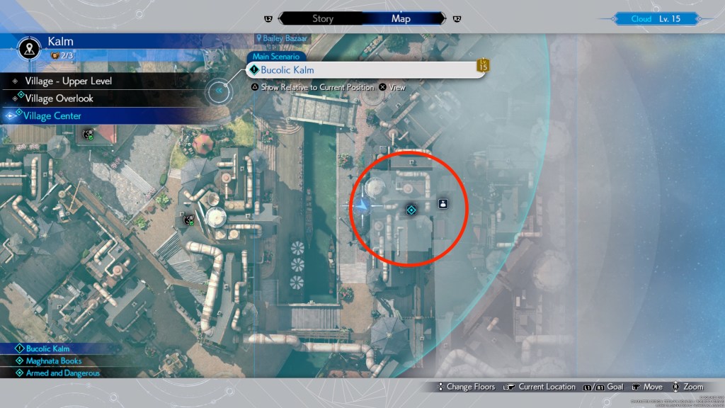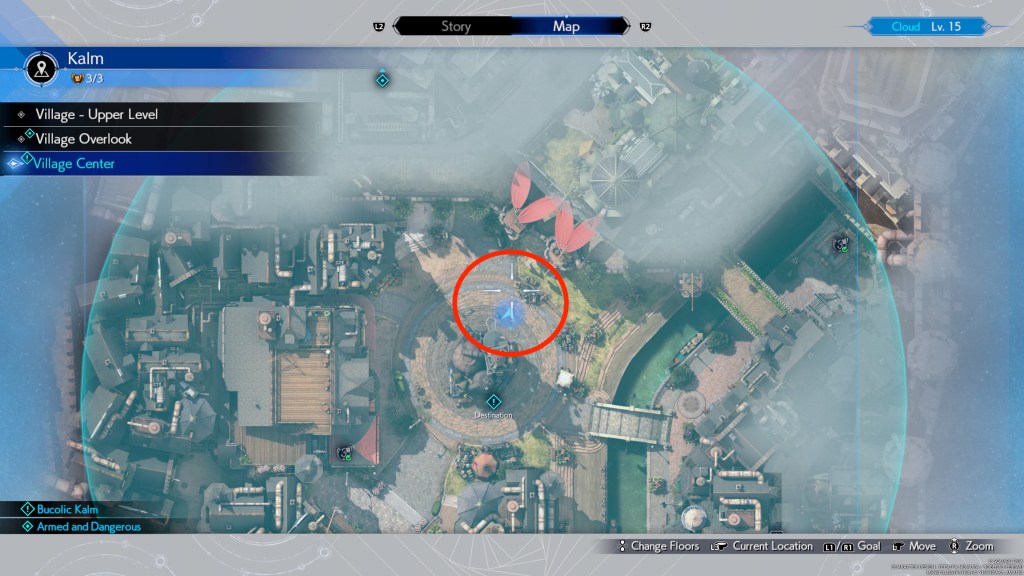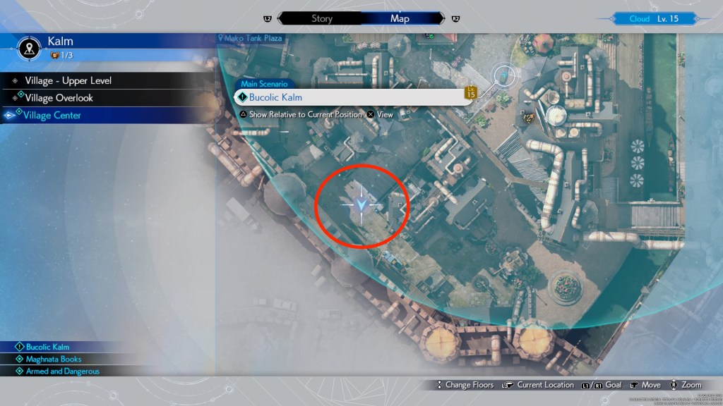 Tifa is a little tougher to find, but if you see the main campaign quest marker for Bucolic Kalm in the center of town near the Mako tank, you’ll quickly find her. She’s hanging out, looking at it.