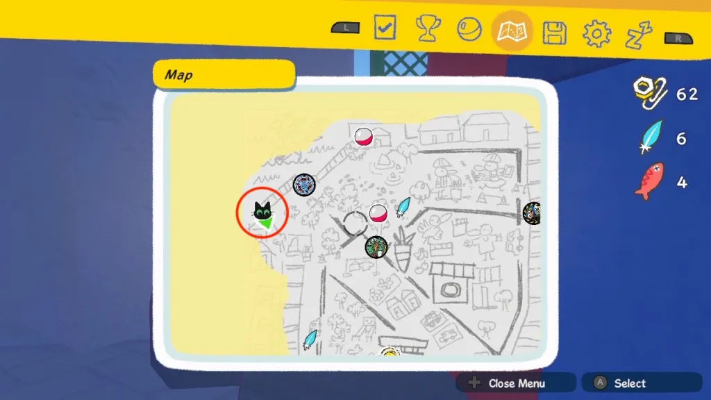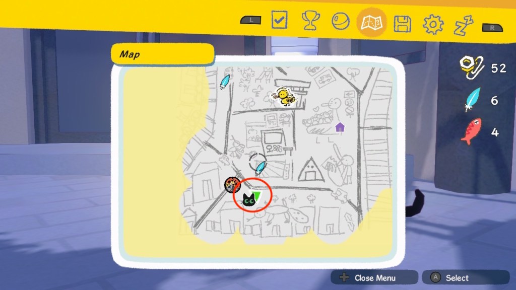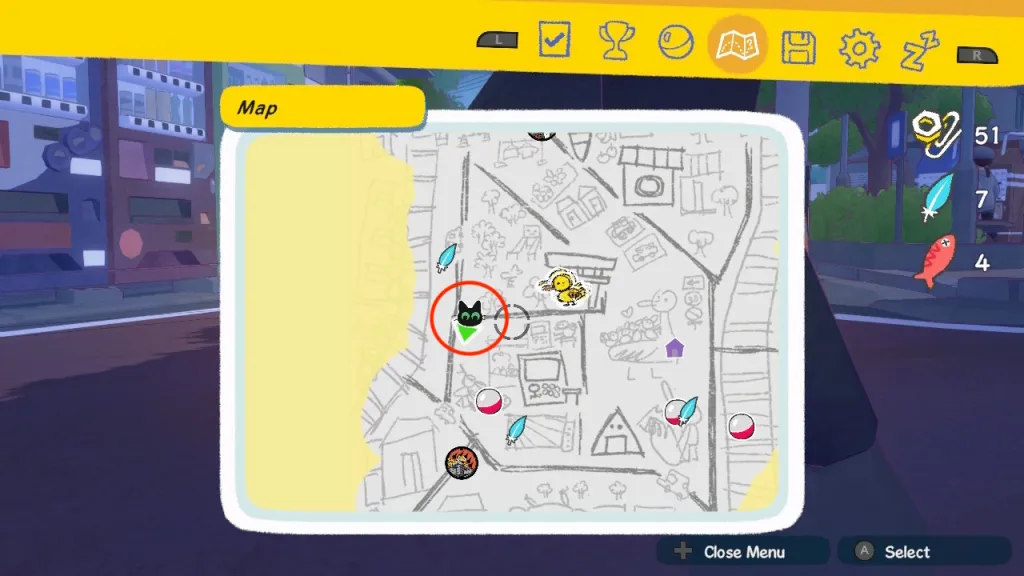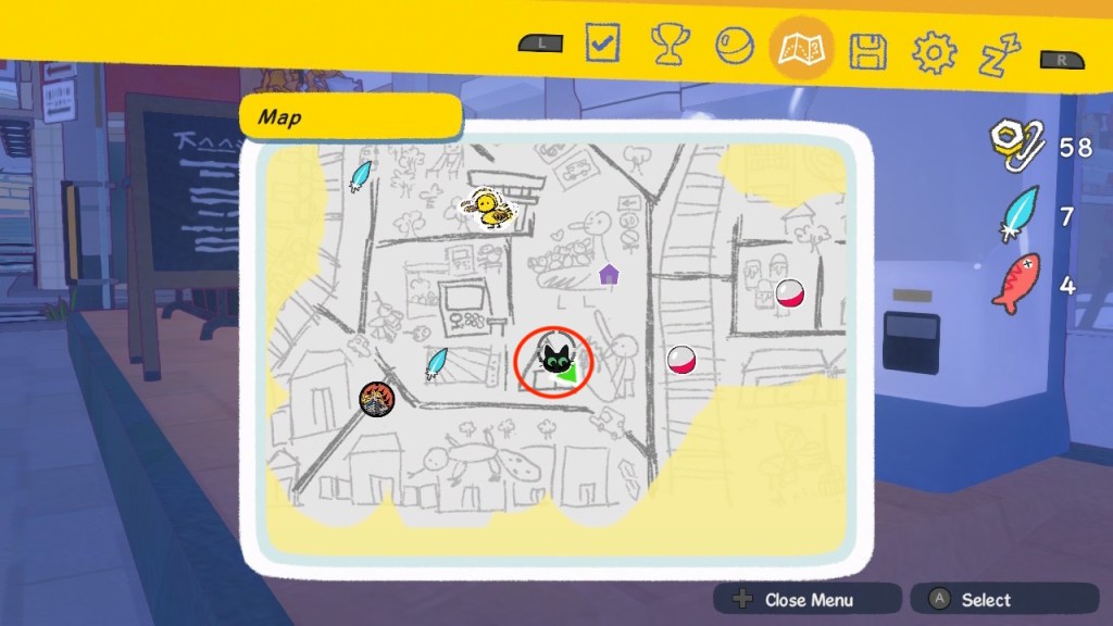 I find it easier to go by landmarks than the map in Little Kitty, Big City when looking for things, but a general awareness of the area can help when searching for the crows and the cat hat gacha machines. There are five main ones, each with four hats. The price per hats are either 5 Shinies or 10 Shinies, depending on the machine. Also, while it is random which hat you get, each machine only features four designs and you won’t get any duplicates.