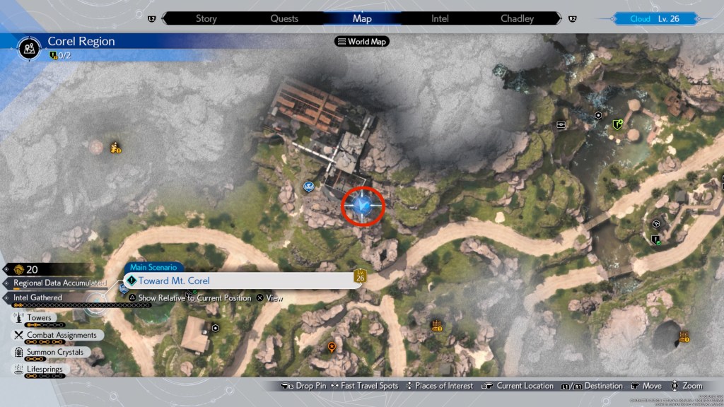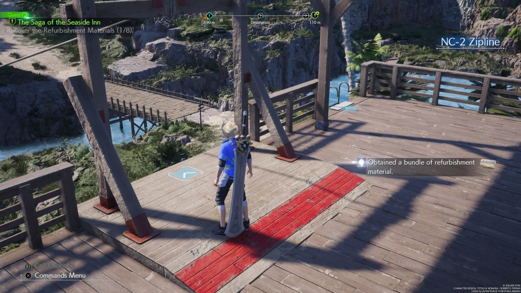 They’ll tell you that they need the eight Refurbishment Materials, which they dropped while running from fiends. What they won’t say, unless you ask for more details, is that they dropped them at the ziplines. So you need to visit the eight ziplines in this area and grab the key Refurbishment Material items at the top platform for each of them.