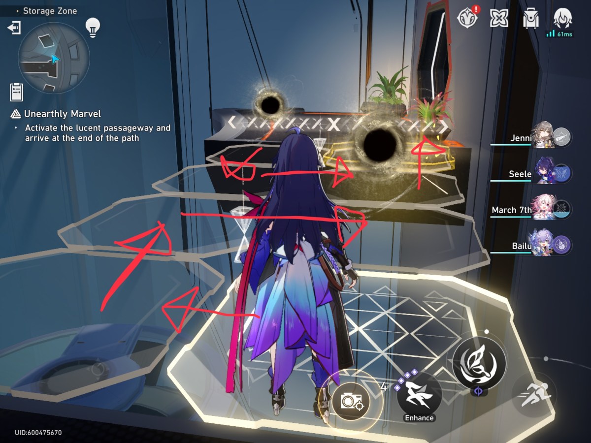 For some reason, I found the Honkai: Star Rail “Signs of Fragmentum,” Difficulty III stage’s Wubbaboo to be the easiest ones to find. Like the second stage, there are five hidden around. The only real trial here is that some of the monsters are rather difficult, due to this being a recommended level 38 map. So even though you can’t access the overall map, the light panel puzzles and hidden Wubbaboo locations are pretty obvious. The first Wubbaboo is right in the elevator shaft you step out of when the challenge begins. Just run around and look down. You should see the little buddy floating like in the screenshot below.
