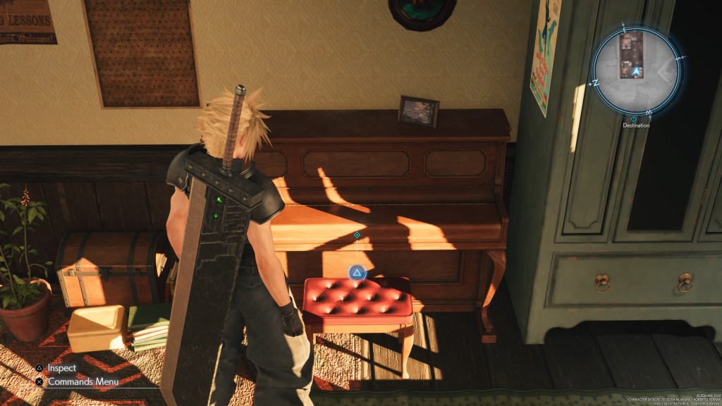 The other room on the second floor is Tifa’s. Go inside. You’ll see a wardrobe when you’re in there. You can interact with it with triangle, but doing so upsets both Tifa and Aerith. Her piano is also next to her bed. Go ahead and say you “went to town on it” and played it.