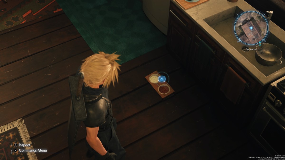 There are a handful of interactions with various items in the place that trigger dialogue from Cloud, Tifa, Barret, and Aerith during the retelling. First, head to the kitchen on the first floor of the house. In front of the sink are two bowls on the ground. Interact with that with the triangle button to kick off some exposition.