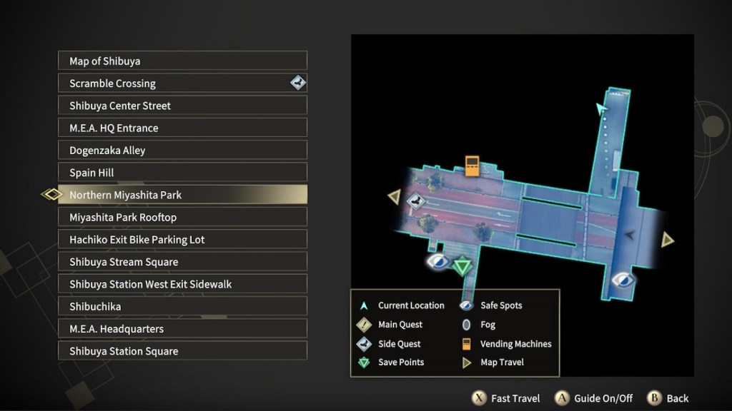 After interacting with the last sticker in Shibuchika, you will discover this sticker has also expired, and you will be asked to head to Northen Miyashita Park via a text message. To get there, follow the yellow exclamation mark sign, which is found on the map. When you reach Northern Miyashita Park, go down the path in front of you and travel down underneath the bridge. Turn left and go through the door with the metal fence.