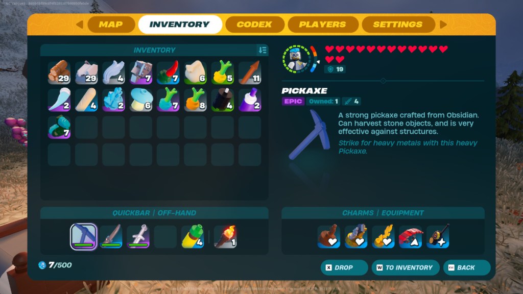 You’ll also need an epic pickaxe to mine the malachite. They can be made with obsidian slabs and frostpine rods. You can find obsidian in Dry Valley, and the frostpine to make the rods can conveniently be found in the Frostlands! Make your pickaxe and charm, prep your food, and you’re ready to go.