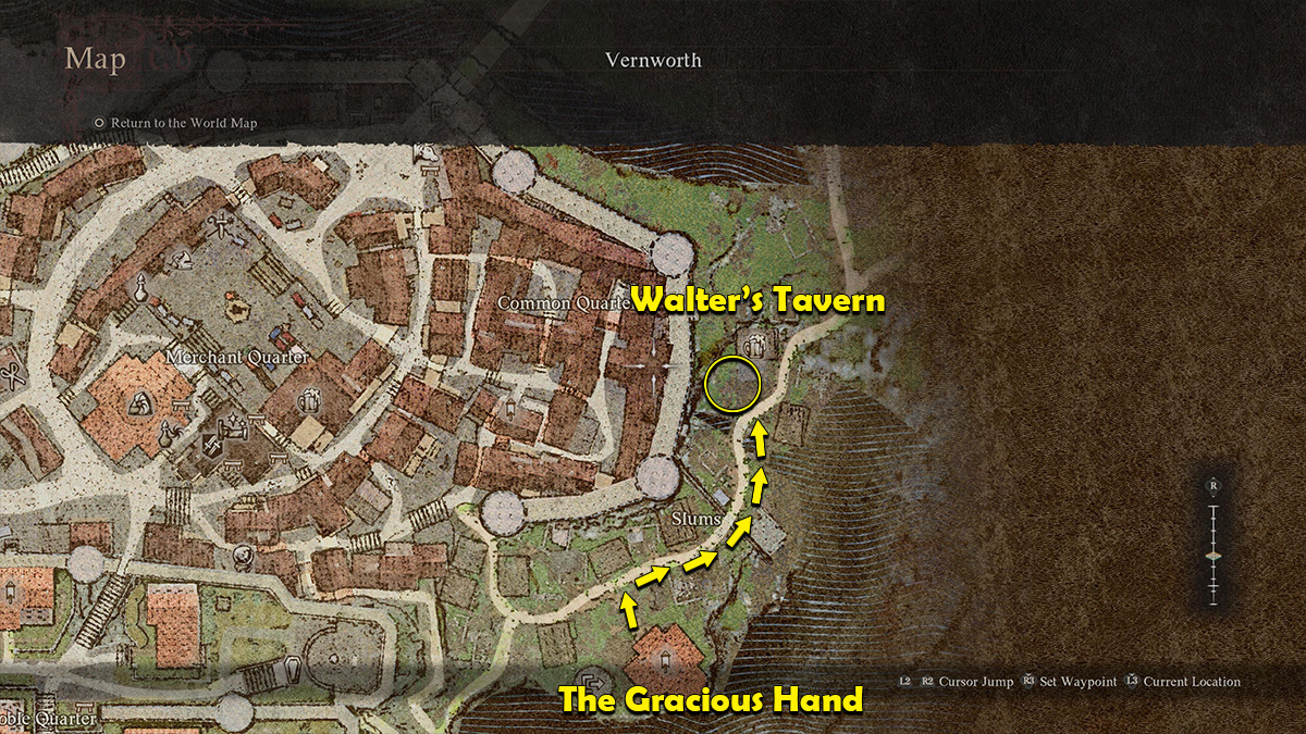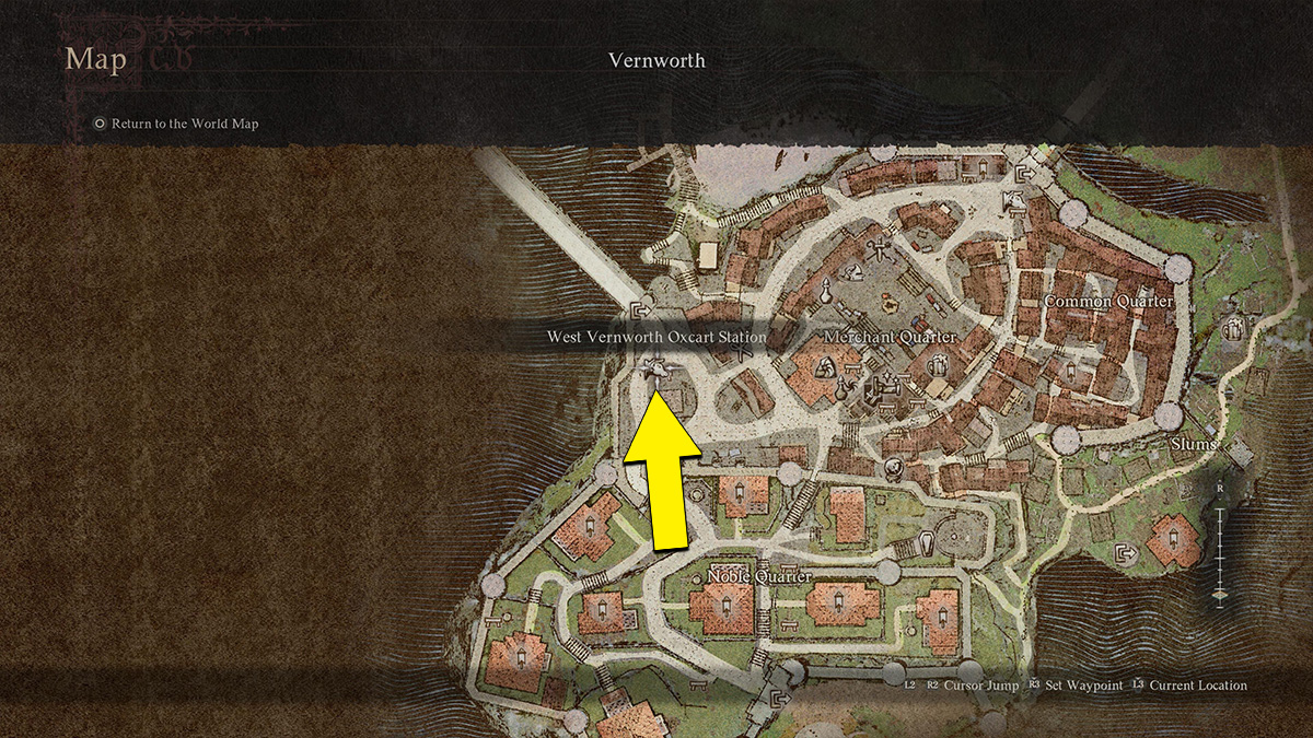 The final step is to head to Rest Town to get the Unlabeled Medicine checked out by a doctor named Radcliff. The quickest way to get to Rest Town in the Saint of the Slums DD2 quest is to take the West Vernworth Oxcart Station. For your convenience, I have provided a map below that shows its exact location: