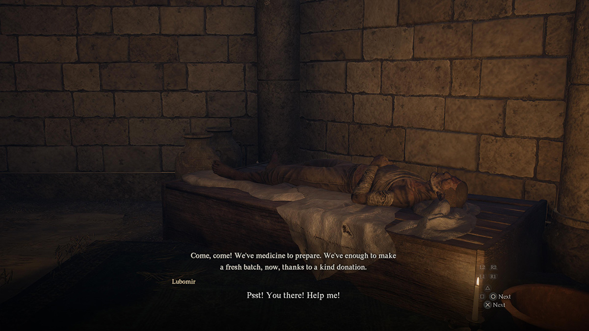A cutscene will now trigger, and you will walk inside the Gracious Hand building. After speaking to a sick patient named Lubomir, wait for Elena to leave. Lubomir will then tell you that he believes Elena is poisoning him and will ask you to investigate the Gracious Hand.