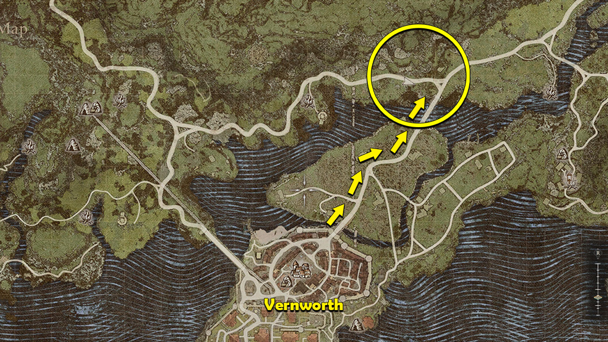 Miasmite can be found outside the north Vernworth exit in Dragon’s Dogma 2 and can only be obtained by killing Phantom enemies during night time. For your convenience, we have provided a map below that shows you the quickest place to find Miasmite for the Saint of the Slums DD2 quest: