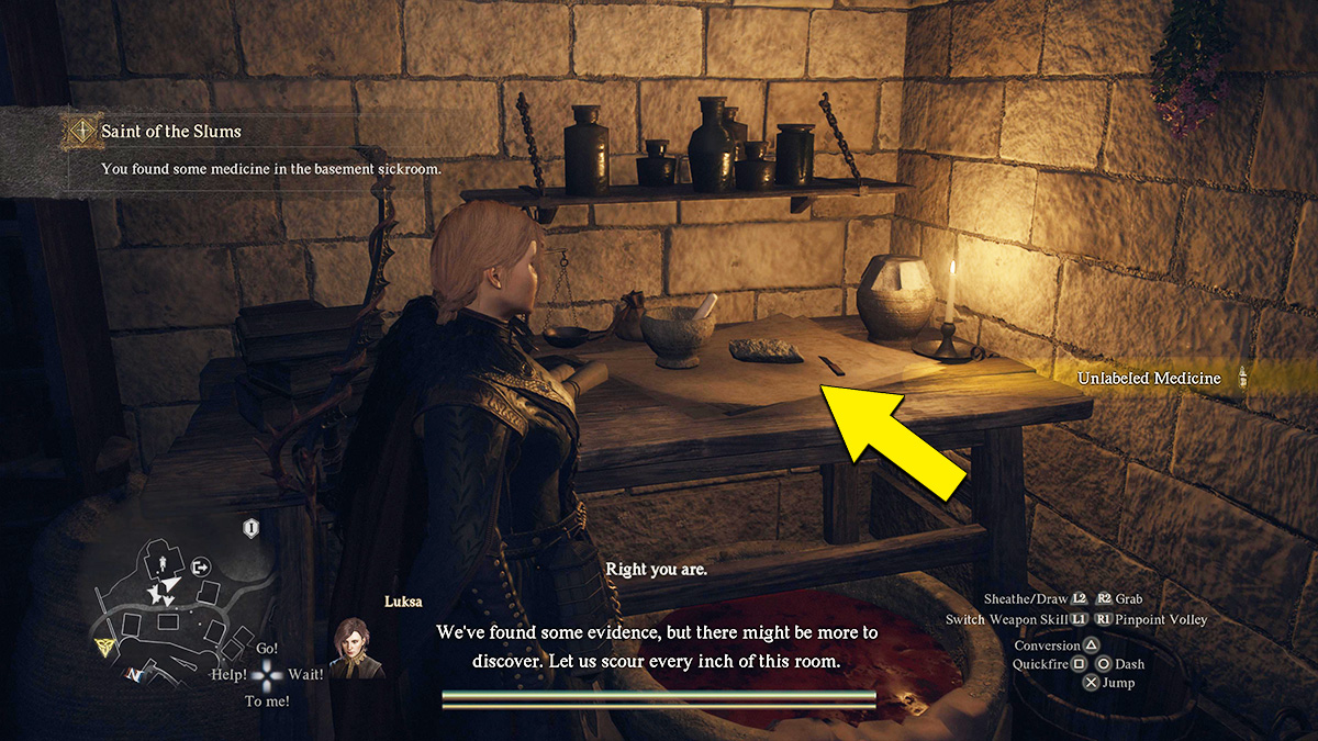 The second item you need in the Saint of the Slums quest is the Unlabeled Medicine found on Elena’s desk. Head over to the east side of the room and look for the giant wooden table. The small bottle of medicine can be found in front of the mortar and pestle.