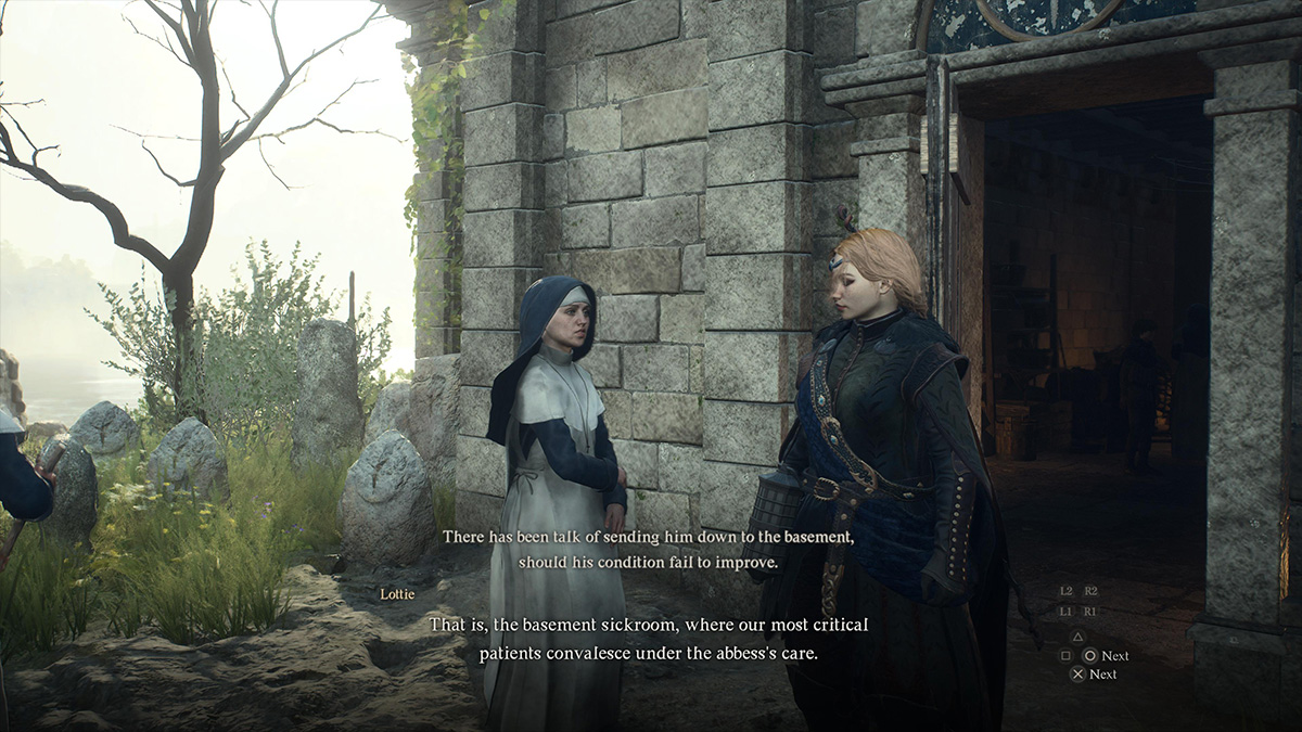 The second part of the Saint of the Slums DD2 quest has you investigating The Gracious Hand. To kick this off, exit the building and speak to Lottie, who voices her concerns about Elena taking patients to the “basement.” After hearing this, re-enter the Gracious Hand building and speak to Lubomir again.