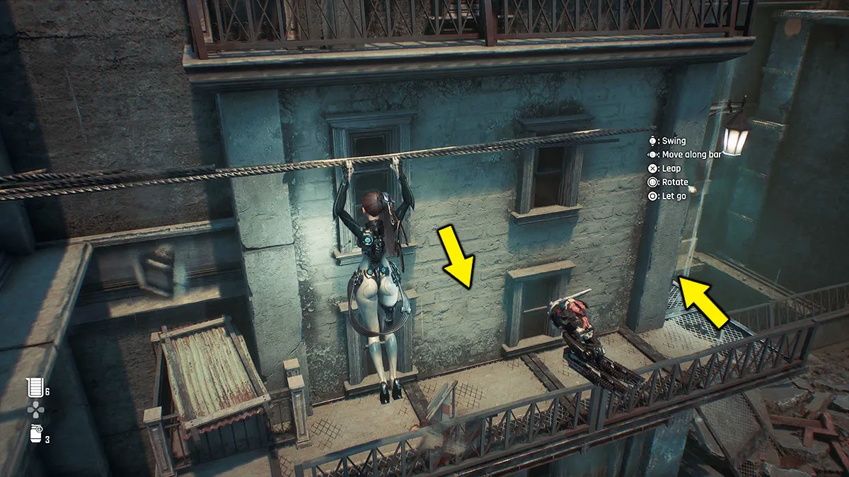 After you land on one of the bars, keep swinging and jumping until you reach the metal grate walkway. The Pharmacy Passcode is just around the corner, so take the walkway around the corner of the building.