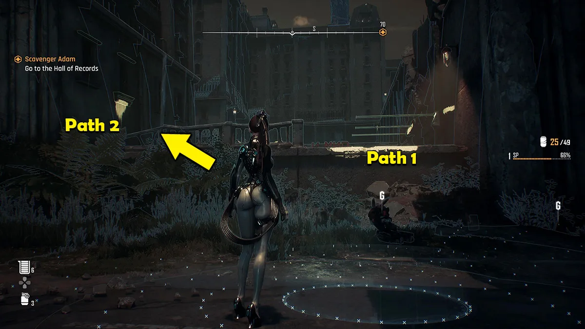 However, you want to take the second hidden path on the left side of the level instead. Here, you will find steps alongside the wall that will let you scale up the building. For your convenience, I have provided an image above that shows this path.