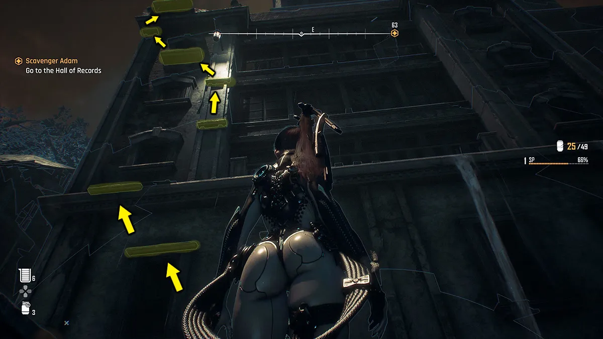 You may need to use the game’s “scan” function to see the building steps, as they are hard to see at first. Double-click your controller’s touchpad, and the steps should be highlighted in yellow. Once you see them, climb up the building.