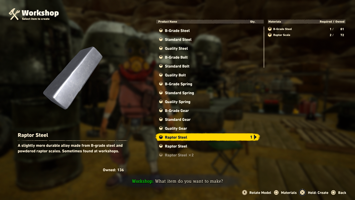 Unfortunately, the first batch of items available in the Lisab workshop doesn’t include Raptor Steel, and you can only craft it after you have created your second vehicle, the Jump-bot. However, it is very likely that you might be in need of Raptor Steel to build the aforementioned bot.