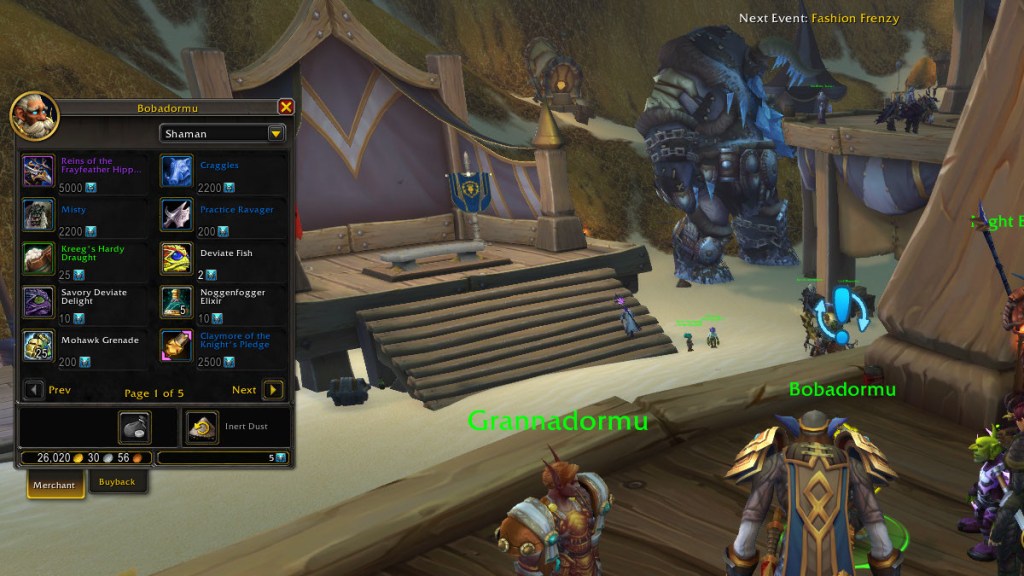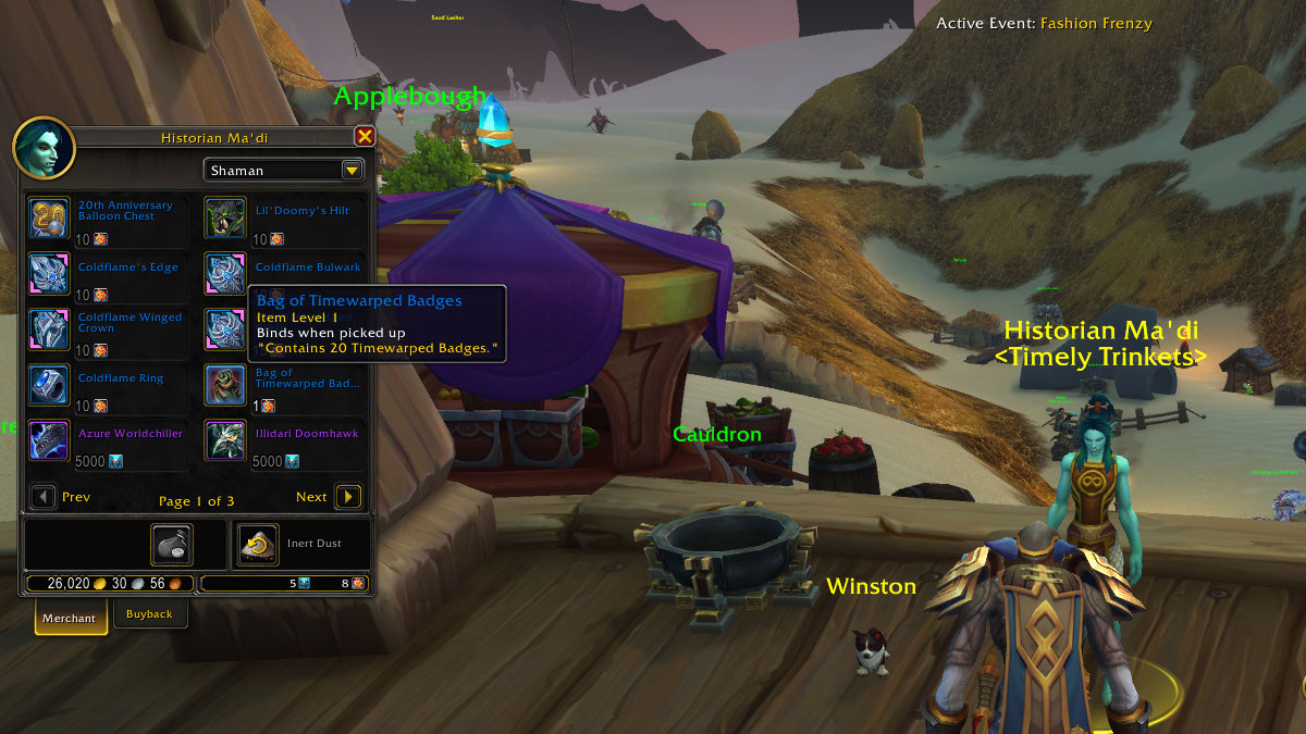 Bobadormu is the classic timewalking vendor. He can be found underneath the big top outside the Caverns of Time during the 20th anniversary event. His list of available purchases include reputation commendations, transmog cosmetics, and novelty items like the Mohawk Grenade. To purchase his wares you’ll need Timewarped Badges, but you’ll want to save up 5000 of them to buy the Reins of the Frayfeather Hippogryph, Bobadormu’s most expensive item and an exclusive mount.