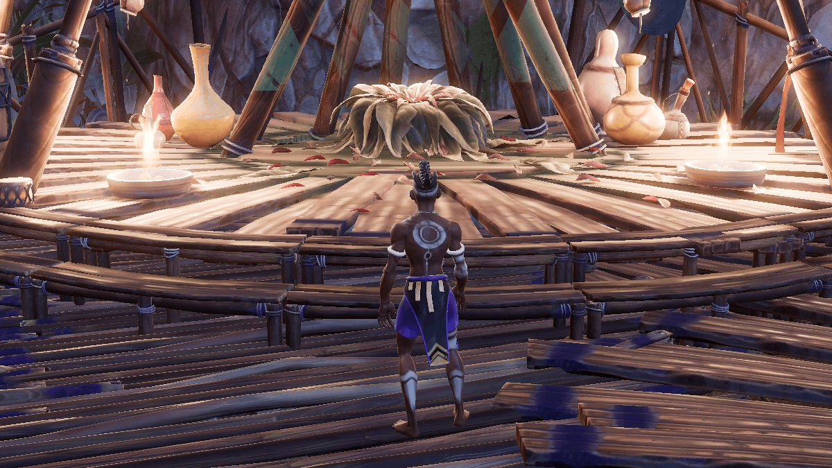 To begin searching for Zawadi’s Hook, head left from the heart of the village to find Sabulana’s home. You can find some clues to the locations of the three ingredients here. Jump through the higher floors of her home and continue until the ledge ends. Drop down to the lower level.