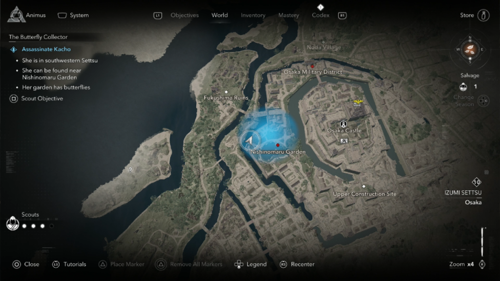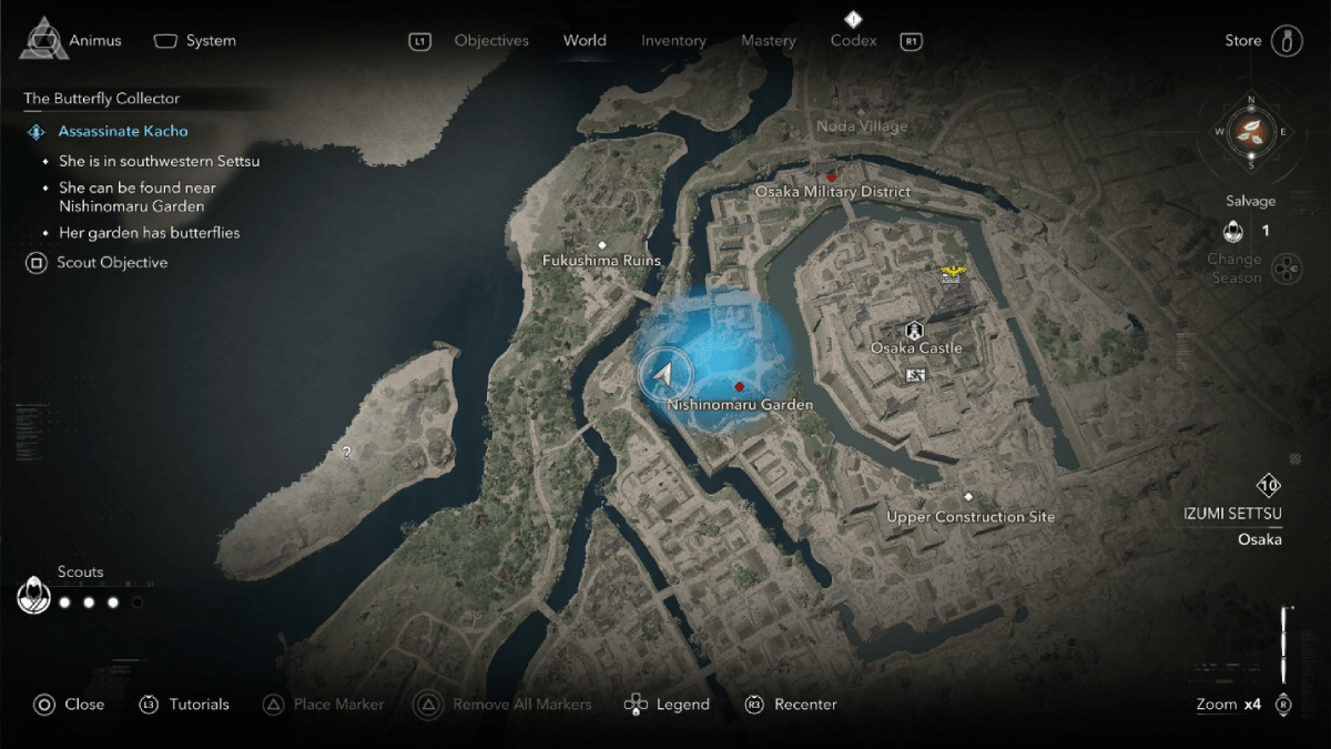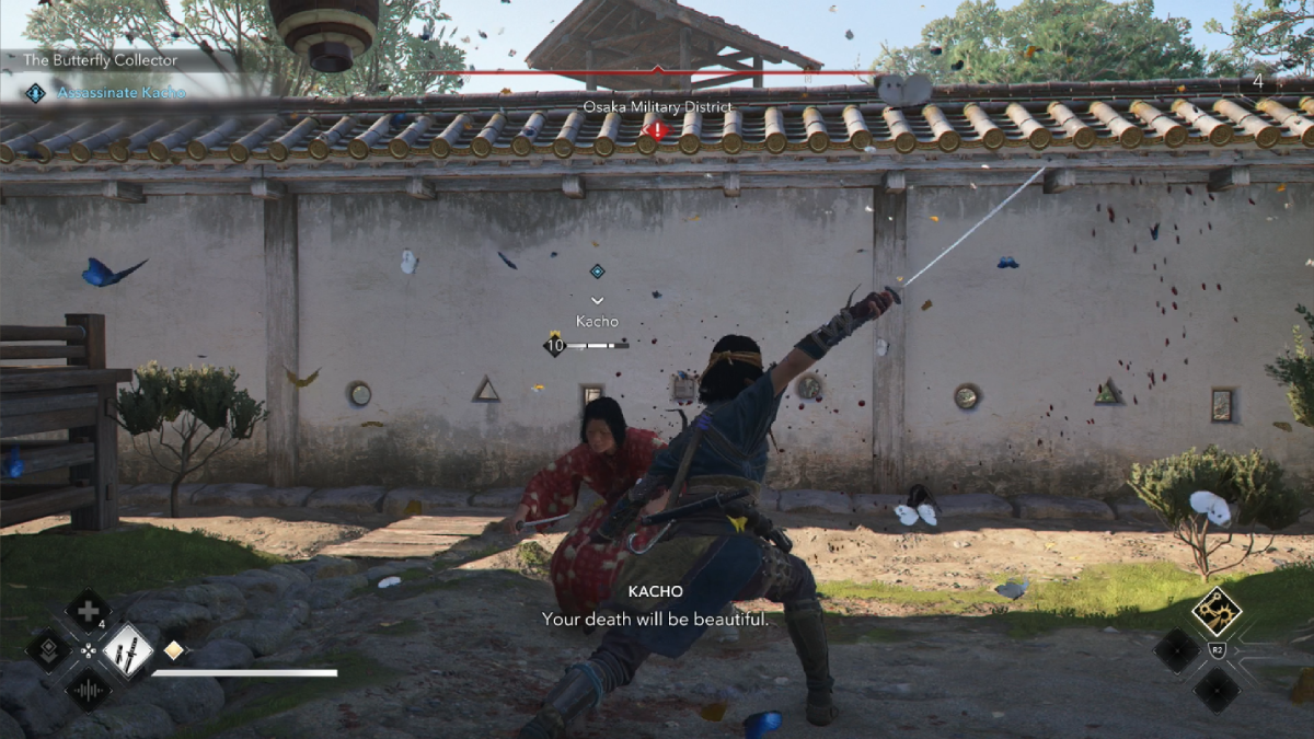 Visiting these places reveals that Kacho is in Nishinomaru Garden, in the neighborhood immediately west of Osaka Castle. This is a heavily guarded location, but fortunately, Kacho’s home is near the outer wall. You can find it on the western corner of the Garden, with butterflies in the garden. Sadly, stealth tactics are out here, as approaching Kacho activates a cutscene and a fight.