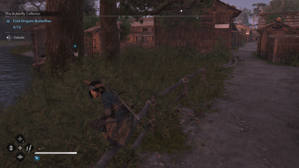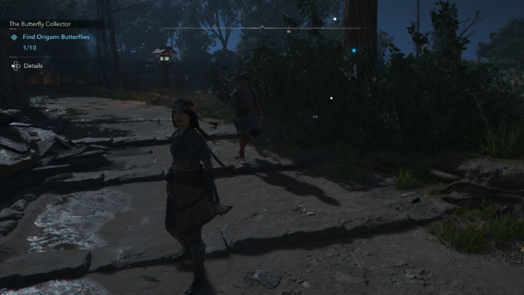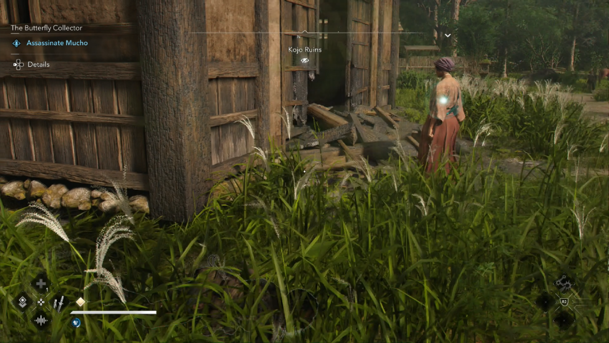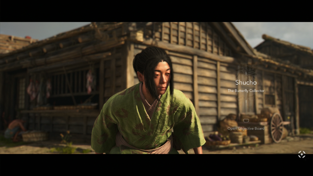 As you collect the origami butterflies, you’ll find messages referring to a criminal ring. It’s now up to you to take out the members of this criminal ring. You’ll find a crying child near the last butterfly. Speak to her and the first of your targets, Shucho, will make her appearance just down the road from the stable. Fortunately, she’s standing by a bush so sneak into it and take her out silently.