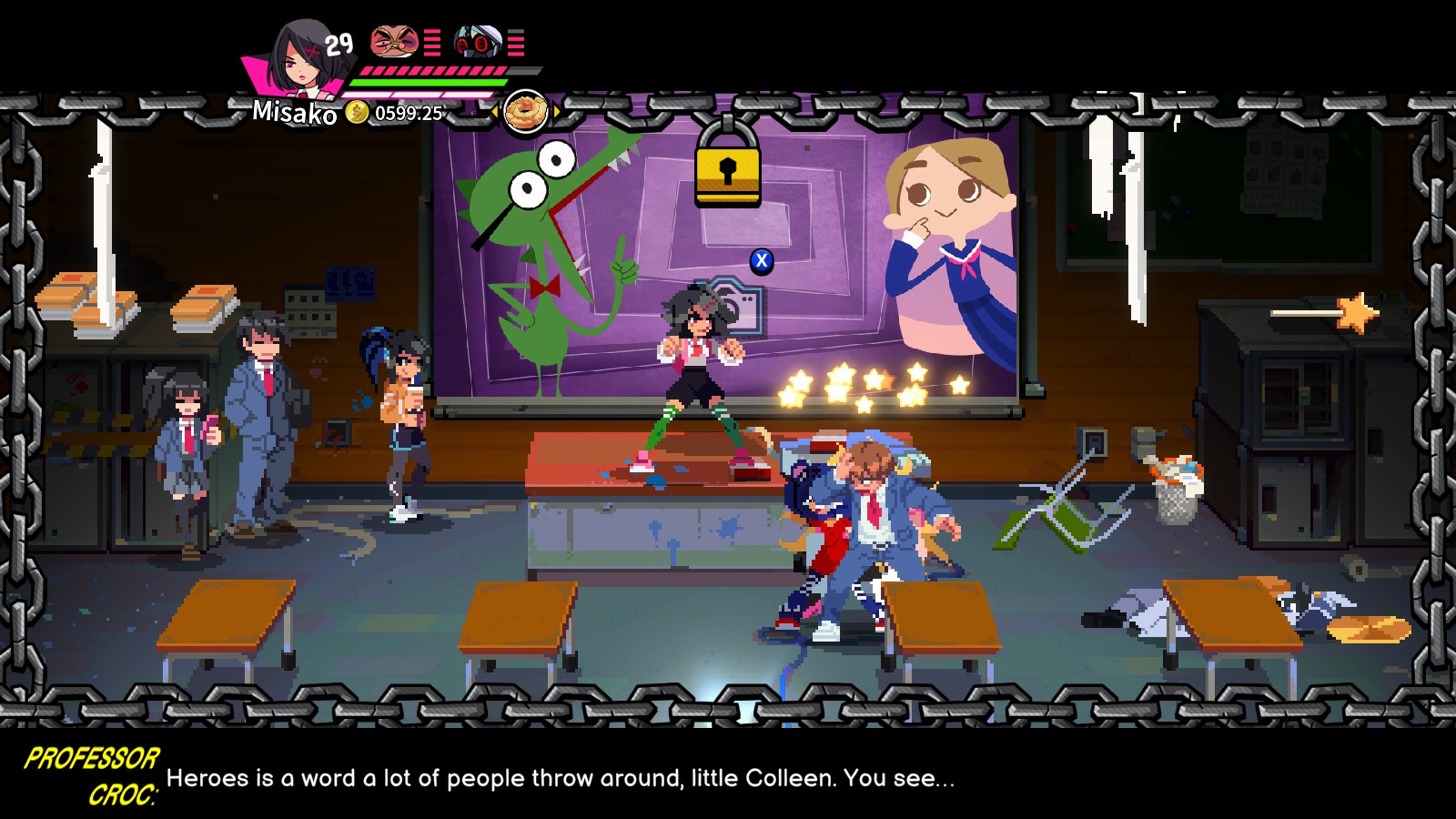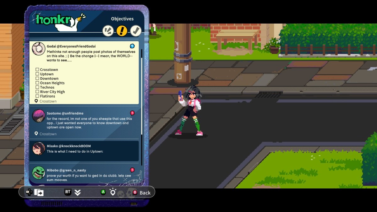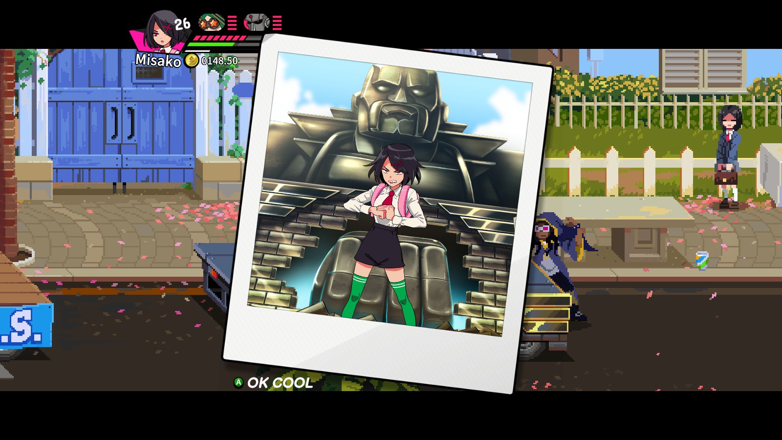 To do Godai’s quest, you’ve got to talk to Godai. Luckily, side quest notifications pop up when they’re available. Godai should contact you via the Honkr app after you clear the mall area, pinpointing his location at the docks in Crosstown. Godai will request that you take selfies in each River City Girls 2 zone (except Sanwakai Tower). He rather unhelpfully tells you to “use the camera app on your phone”, which can be confusing, since River City Girls 2 doesn’t have a way to take pictures manually. What Godai actually means is that you should be on the lookout for special action prompts in the environment. They look like a camera, and indicate a spot where you can take a selfie, and there’s one in each River City zone (except Sanwakai Tower). Putting your character near the prompt and hitting the interact button will take a selfie and clear one of the quest requirements. You also won’t be able to clear the quest as soon as you get it, as not every zone is unlocked at first. Simply proceed through the story, and as you unlock each zone, you’ll eventually be able to visit the needed area. Your reward for completing the River City Girls 2 selfie quest is the Muscle Charm, an accessory that maxes out the knockback effect of your heavy and special attacks, sending enemies flying off screen and into walls, objects, or other enemies.