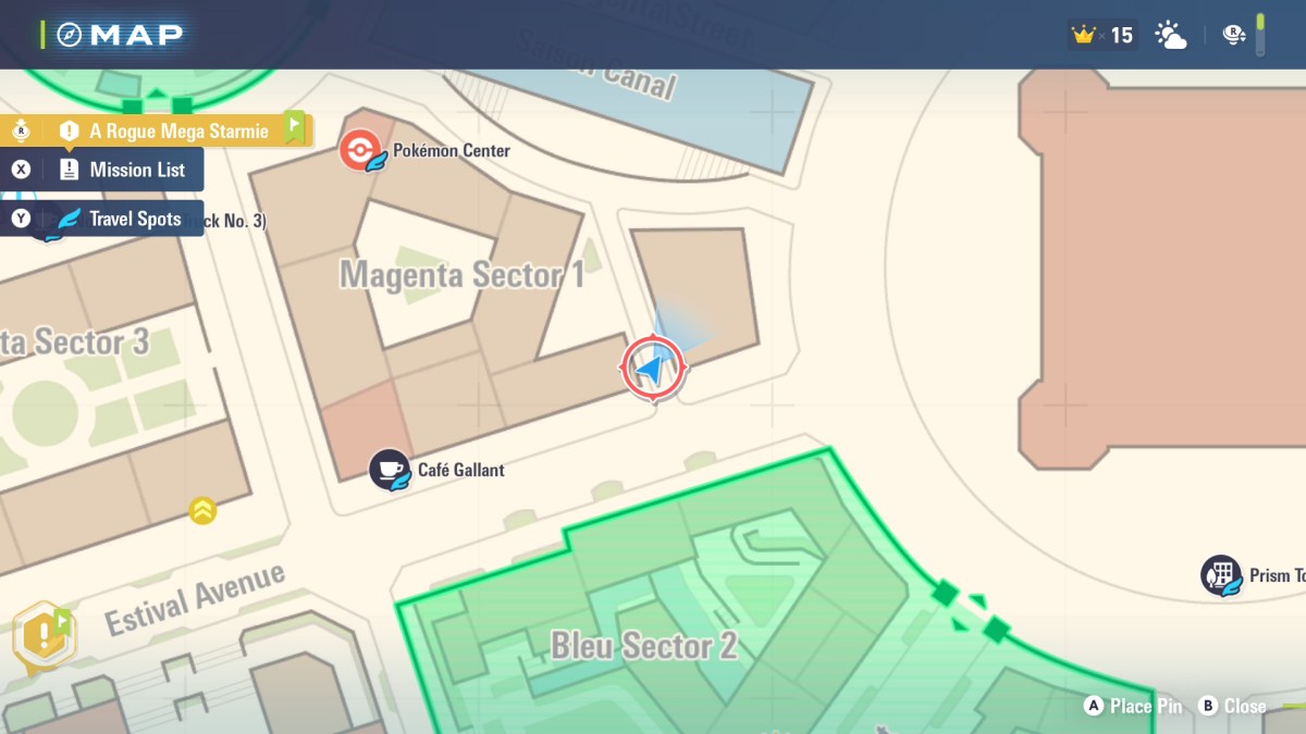 Now, at a glance it seems like there could be four buildings that might meet this criteria. However, we want the one in Magenta Sector 1. The ideal place is the building just south of Saison Canal and Magenta Street, while also being just east of the building with the Pokemon Center and Cafe Gallant.