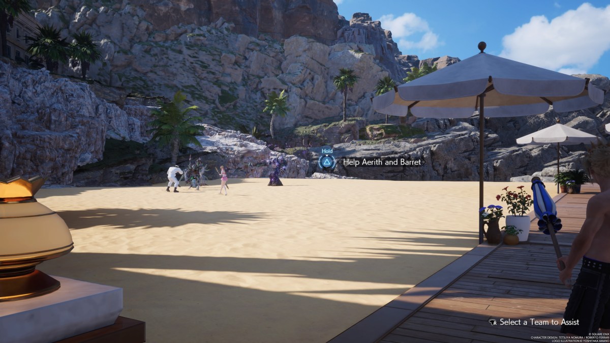 Once Cloud, Aerith, Tifa, Barret, and Red XIII finally get to the beach in Costa del Sol, they’ll find Hojo is there and using the hooded individuals to start a fight. However, after Cloud heads to the private beach armed with an umbrella, you are given an option to take part on one of two teams for a fight. Tifa and Red XIII are on one side, while Barret and Aerith are on the others.