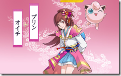Oichi is Nobunaga Oda’s younger sister. She has a kind personality in the Samurai Warriors games and she prefers a peaceful world than the war torn Sengoku period. Jigglypuff joins her in Pokémon + Nobunaga’s Ambition.