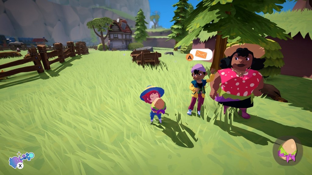 A scarf on the giant egg hints that it needs to be delivered to Cecile and Jean-Paul back at the Farmlands. If you’re still on top of the windmill roof, glide in the left direction, and you should have enough height to reach the Farmlands with no problem.