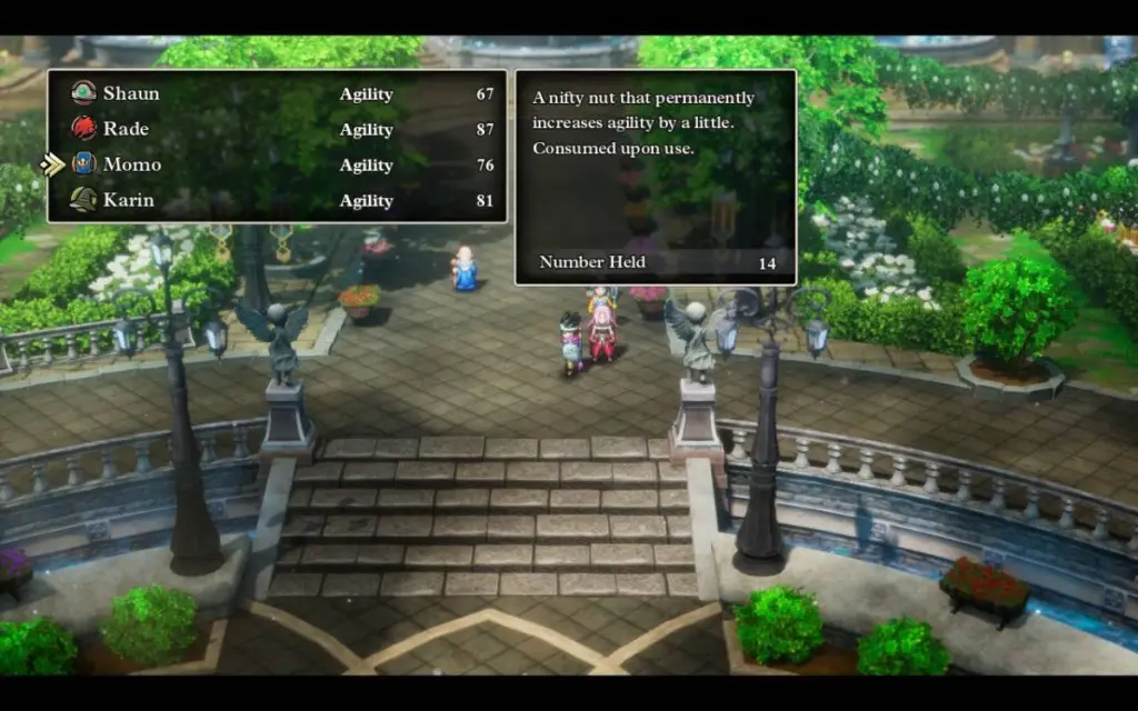 Seeds of Life give the character more HP, Seeds of Resilience improve physical defense, Seeds of Stamina will help the character get more HP in level-ups, and Seeds of Agility will improve the character’s speed, allowing them to act earlier in battle. Personally, I like to give Seeds of Agility to my healer to make sure they can act first in a pinch. The other Seeds are best used to raise up whoever has the lowest score in that stat. Enemies will usually attack the front members of your party more often, but some are programmed to aim for the rear members. Everyone needs to be able to take a hit or two.