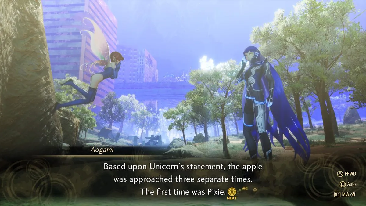 After you talk to all of the parties, you can start to assemble the truth behind who stole the apple in Pixie on the Case in SMT V Vengeance. The gist of it is Unicorn establishes someone visited the apple three separate times. The first time was the Pixies, the second time was the Agathion group who ends up being innocent, and the third group is the culprit.