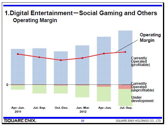 Why so many social titles? Because they’re cheap to develop and more consistently profitable than console games, says Square Enix president, Yoichi Wada. The above chart shows the state of Square Enix’s social games, giving a glimpse of how many are profitable (blue bar), how many are unprofitable (red bar), and how many are still under development (green bar). As you can see, the vast majority are raking in profits. If a social game flops, it doesn’t hurt Square as much, since these titles aren’t particularly expensive to make. “In HD games, we usually have a mixture of profitable and unprofitable titles, generating profit as a whole,” Wada says. “As for our Social Gaming & Others [division], we only have very few titles that are unprofitable.” As a result of this, Wada adds, Square Enix will be increasing their investment in social gaming. This doesn’t mean Square Enix are going to stop developing regular games, though. As we reported last week, their console and portable games output has been set back by the challenges of Final Fantasy XIV, which is a situation they’re looking to rectify, going forward. However, Square expect that they won’t see significant growth in console game earnings for another 2-3 years, after which Wada says he expects to see considerable growth owing to new business models.