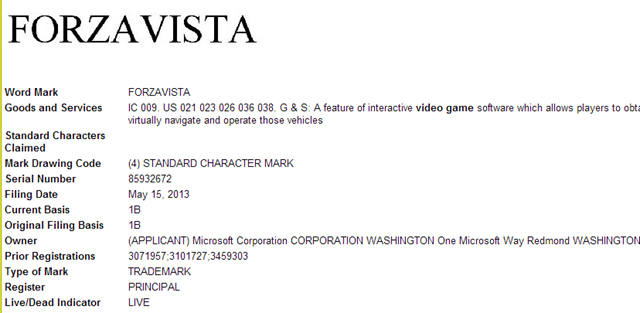 Jokes about a Forza Motorsport game aside, the Forzavista trademark is filled under IC 009, the usual class for video games and game software, but the description is rather specific. Forzavista is "a feature of interactive video game software which allows players to obtain statistical information of internal and external features of a vehicle and to virtually navigate and operate those vehicles." Compare this to the trademark for Forza Motorsport which is for "computer programs, namely, game software for use on computers and video game players."