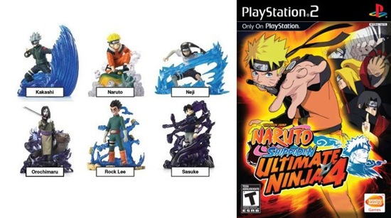 One winner will get a copy of Ultimate Ninja 4: Naruto Shippuden for the PlayStation 2, a figure from Mystery Naruto Figure collection – Series 2 (pictured), and a figure from the Mystery Naruto Figure collection – Series 4 (Jiraiya, Itachi, Kakashi, Naruto, and Sasuke are in this group).
