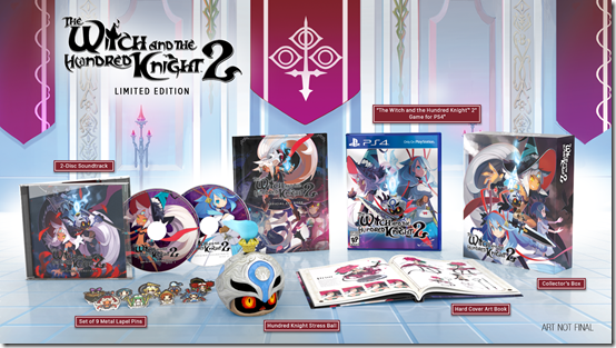 The limited edition of The Witch and the Hundred Knight 2 is $79.99 through the NIS America Online Store. It comes with a copy of the game, 9 lapel pins of the major characters, a stress ball of the Hundred Knightâs head, a 2-disc soundtrack, and a hardcover art book.