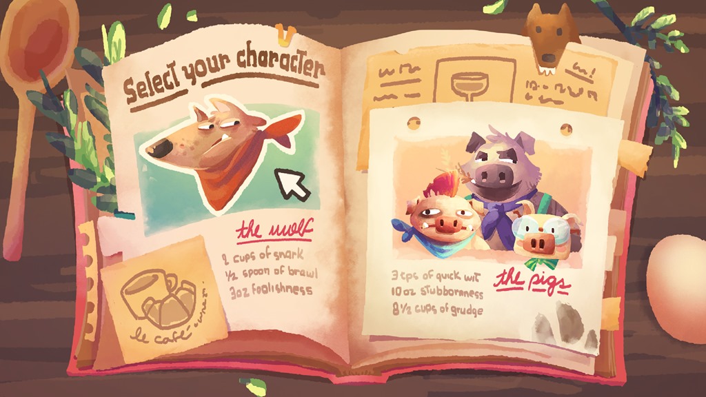 The Wolf’s Bite is a competitive storytelling game for two players, whether both of them take turns making narrative decisions in a fairytale about the Big Bad Wolf trying to open a restaurant despite sabotage from the Three Little Pigs.