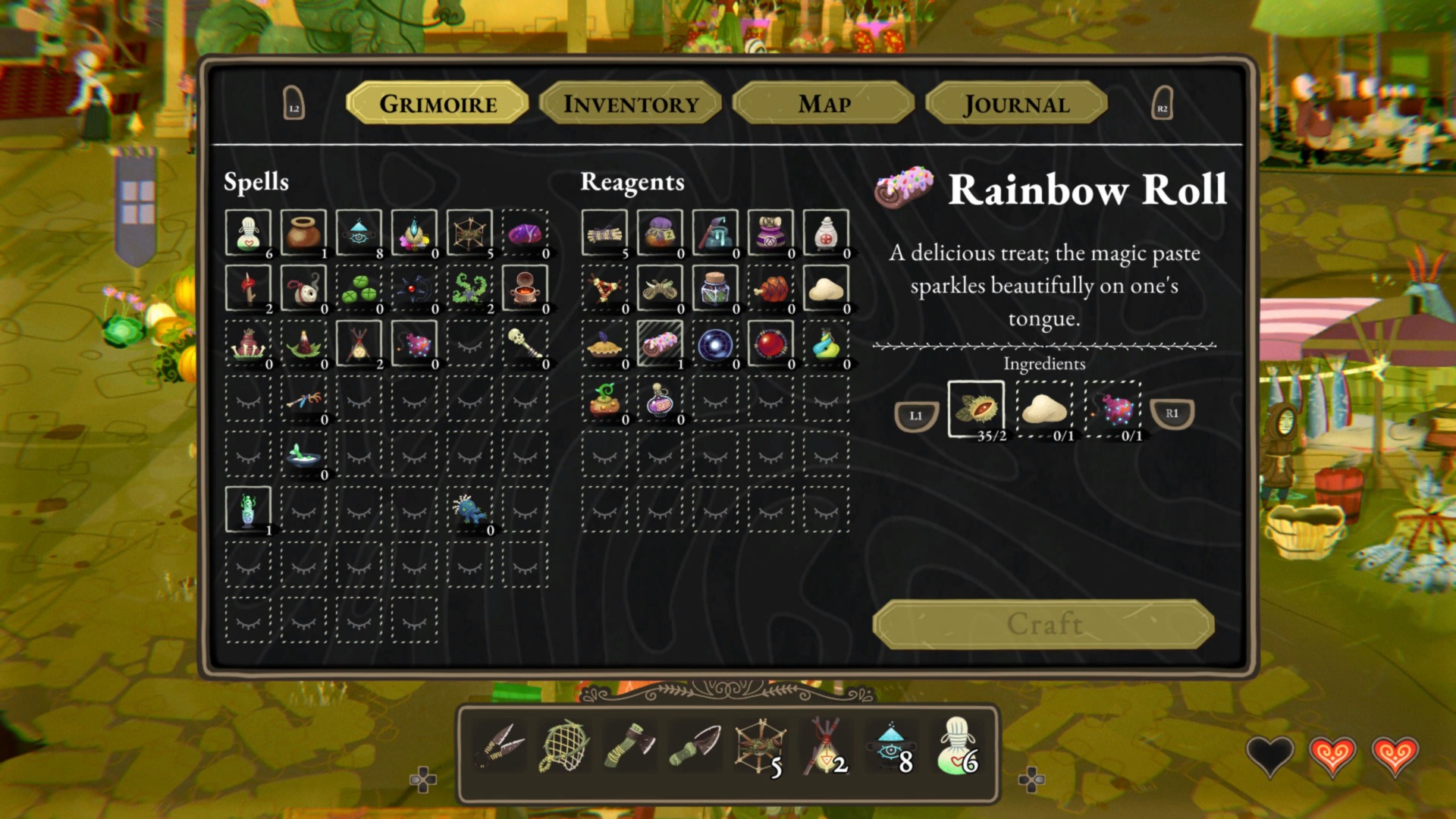 In this case, Wytchwood blends what I love about the action adventure genre and adds a crafting element to the mix. You need to know your ABCs: Always Be Collecting/Crafting. Plenty of crafting items can be harvested from your surroundings. You’ll also collect items from any wildlife you trap and pesky creatures running amok. Learning new recipes is easy peasy. The Witch’s eyesight reveals weaknesses and other useful information. If there’s a unique item to deliver for a quest, the recipe will reveal itself should you not already have it. The ingredients you need might not always be local. For example, you won’t find dryad hearts in the graveyard. Nor are newts hanging out in the fields. If you ever find yourself trying to remember where you collected that one missing item you need, highlighting it within the grimoire shows where to find it. If it’s another craftable item, it’s just a quick button press away. It feels like flipping the pages in a cookbook. Exploring these areas is just wonderful. Nothing ever seems too cluttered or too barren. NPCs bustle around the city and its surrounding hubs, while the rural locales have very few people to talk to. Resources littering each section respawn at a decent rate. Which is great for farming common items like twigs (which I always seemed to need). None of the areas are too large. Finding where it is you need to go doesn’t require ten minutes of backtracking if you had to leave to find an ingredient. It’s all scored with an absolutely lovely soundtrack that perfectly fits every area visited.