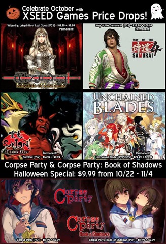 Xseed have dropped the price of a few of their games in North America. On the Nintendo eShop for 3DS and PlayStation Network for PSP, Unchained Blades is now available $20 (instead of $30). On PSN for the PlayStation 3, Wizardry: Labyrinth of Lost Souls has dropped to $10 (from $15), while Way of the Samurai has dropped to $30 (from $40). Finally, on Vita, Sumioni is now available for $10 (down from $15). Meanwhile, there’s also a temporary discount sale running on PSN for PSP, for Corpse Party and Corpse Party: Book of Shadows. Both games will be available for $10 each (down from $20 each) until November 4th.