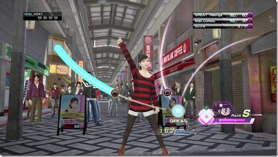 Though, the most prominent use of rhythm in Yakuza 5 comes from Haruka’s chapter. People who’ve been playing the Yakuza games from the beginning know that there’s a combo system that relies on timing to put together powerful attacks. Haruka, as an aspiring idol, fights with the power of music. You’re still beating up opponents, pressing buttons in the proper time, but more effectively doing so in a rhythm game setting. Five music genres appear, and people press the action buttons in time with the music to “win.” They also have to position Haruka at appropriate points by using the directional pad, adding an extra element of coordination. Do well enough, and you’ll keep a metaphorical bomb from being dropped on Haruka, sending it to her opponents instead.