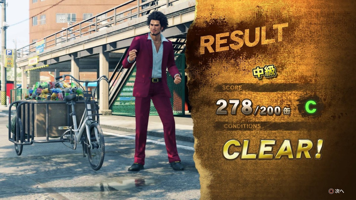 Another way for Kasuga to earn money to live off of in the earlygame is to collect trash from the streets, which has been turned into a Play Spot of its own. Within a time limit, you ride along the streets of Ijincho on a bike wagon, collecting trash, and avoiding other homeless people who are out to take your collected garbage. If you happen to see drinks along the road, pick them up for a speed boost. Your points from the game are turned into Eco Points, which can be exchanged for items, and some homeless people will exchange Eco Points for money as well.
