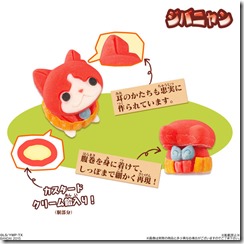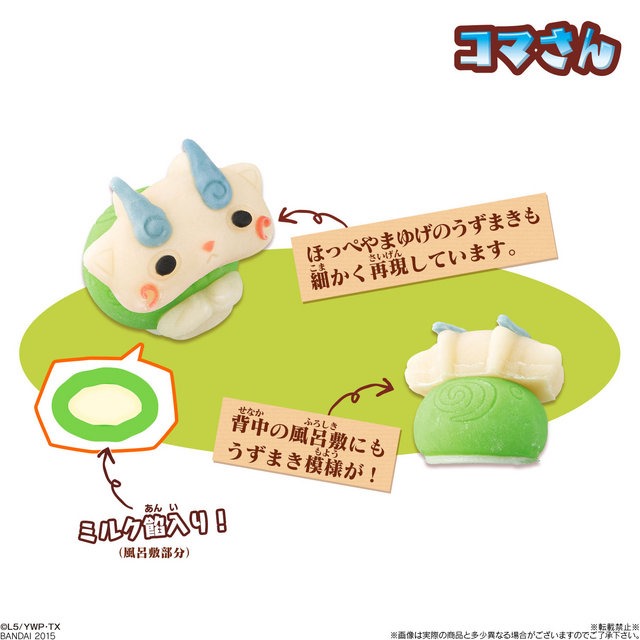 Okashi is the Japanese word for sweets, and wagashi is often used for the more traditional variety of okashi, made with delicate craftsmanship to go with high quality ingredients and detail in the work of art. Wagashi is typically made with plant ingredients, and often with other ingredients such as mochi, or rice cake, and rice flour, making it easy to mold into different shapes or objects. Rather than using the more traditional ingredients of azuki bean paste, the Yo-kai Watch wagashi is made to suit the taste of younger children, with fillings such as custard for Jibanyan, a sweet milk paste for Koma-san, and chocolate for Whisper.