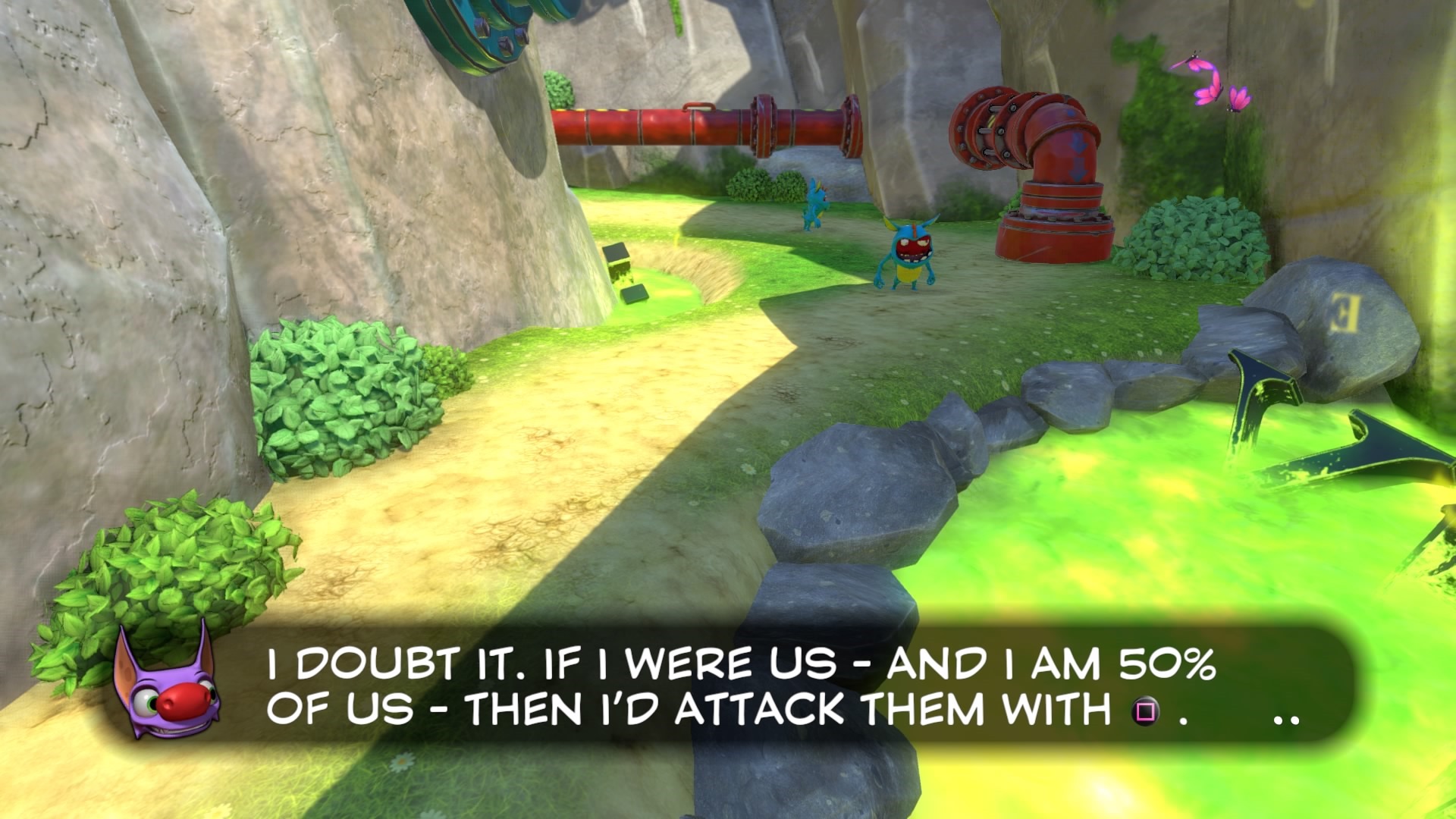 It all begins with Yooka and Laylee, Yooka-Laylee’s dynamic duo. The two perfectly portray a double act. Yooka, the chameleon, is the stooge. He’s a genuinely good guy, which is evident by both his quips, character design, and even actions. When we first meet him, he’s relaxed. He sees the value in a book Laylee has found, even though the bat hasn’t even bothered to read it or think of it as anything important. He’s open when it comes to talking to others, and often quite helpful.