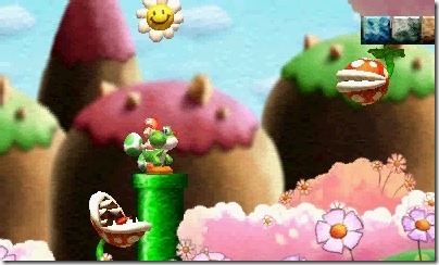 Whether your referent is Artoon’s incredibly bland Nintendo DS game or Takashi Tezuka’s Super Nintendo masterpiece, you’ve likely heard the name “Yoshi’s Island” before. Does Arzest ring a bell, though? How about T’s Music Co. LTD. and Masayoshi “Chami” Ishi? No? Masamichi Harada, the game’s art director? I’d bet a red coin you haven’t. Getting some new blood in an old franchise is exciting, though, and with so many new faces coming together to revisit one of Nintendo’s classic platformers, it’s got to be something special, right? …sort of. If I had to use an analogy, I’d say that Yoshi’s New Island is to Super Mario World 2: Yoshi’s Island as New Super Mario Bros. is to Super Mario Bros. I’d also say that Yoshi’s New Island is to Super Mario World 2: Yoshi’s Island as Kirby’s Epic Yarn is to Kirby’s Adventure. You gain some things, lose some things, and while the experience is nostalgic and leaves at least one lasting impression, you can’t help but feel like something was missing. Let’s go over what Yoshi’s New Island isn’t missing first—a love-it-or-hate-it visual style. By now, everyone should know that 3DS screenshots simply lack some luster, especially if they aren’t captured via Miiverse, which appears to come with some sort of high-quality magical screen-capturing technology. After much debate I’ve settled on describing the character designs as “3D models drawn with colored pencil,” and the backgrounds range from sumi-e (ink wash painting) swamps to crayon scribble canyons.